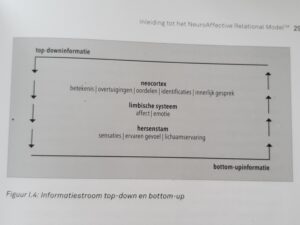 Ons zenuwstelsel vervoert informatie van boven naar beneden (top-down) en van beneden naar boven (bottom-up). Top-down zijn het onze gedachten, overtuigingen, oordelen en identificaties (het (zelf)beeld waarmee we ons vereenzelvigen) die invloed hebben op hoe we ons voelen en op onze instinctieve reacties. Bottom-up gaat het om hoe sensaties, ervaren gevoel en lichaamservaring onze emoties en gedachten beïnvloeden. Het schema laat zien dat die twee samen hangen. De beide informatie kanalen zijn verbonden via een feedback loop.