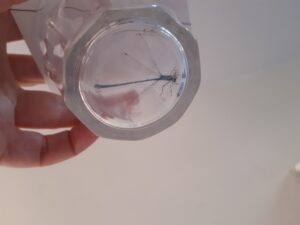 Met een glas in mijn ene hand en een kaartje in de andere wacht ik af tot ie wat rustiger is en op het raam is gaan zitten. Een blauwe libelle, een waterjuffer eigenlijk. Het is een mooi exemplaar, indigoblauw. Ze komen in grote getale uit hun cocon gekropen in deze tijd van het jaar. Ze zitten in de hele tuin en vliegen vaak al parend over de vijver, gaan dan steeds even zitten (om eitjes te leggen?) waarbij de bovenste in een soort u-bocht op de onderste zit. Soms verdwaalt er één in huis, als de tuindeuren op staan. Net zoals alle andere insecten, bijen, vliegen, hommels en mij onbekende vliegende schepseltjes zoeken ze de uitgang bij een raam, lang niet altijd de openstaande deur. Dus dan help ik ze. Vaak. Niet altijd. Een glas en een dun stevig kaartje heb ik nodig en een klein beetje geduld.